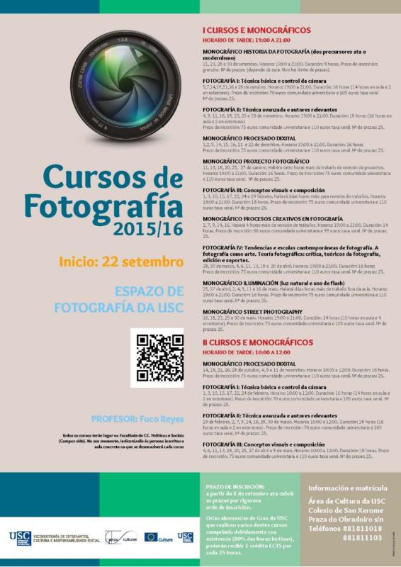O Espazo de Fotografía da USC abrirá o próximo martes 8 de setembro a inscrición paras as prazas dos seus cursos e monográficos sobre a fotografía como técnica e manifestación artística. En quendas de mañá e tarde nalgúns dos cursos propostos, as sesións celebraranse na Facultade de Ciencias Políticas e Sociais. O alumnado de grao que se matricule nalgunha das xornadas propostas e asista ao 80% das horas lectivas poderá recibir un crédito ECTS por cada 25 horas cursadas. Entre os meses de setembro e maio e en quenda de tarde (de 19.00 a 21.00 horas), todos os meses están programados cursos que arrancarán cun achegamento á historia da fotografía para de inmediato continuar tratando as técnicas básicas e control da cámara, técnica avanzada e autores relevantes, o procesado dixital, o proxecto fotográfico, conceptos visuais e composición ou os procesos creativos en fotografía. Tamén están previstos monográficos sobre iluminación, tanto natura como flash; street photography; ou un curso sobre tendencias e escolas contemporáneas de fotografía e particularmente a concepción da fotografía como arte, con especial atención á crítica, teóricos da imaxe, edición e soportes. En quenda de mañá, de 10.00 a 12.00 horas, celebraranse o monográfico de procesado dixital e os cursos de técnica básica e control da cámara, técnica avanzada e autores relevantes e conceptos visuais e composición. Para acadar máis información sobre esta programación, as persoas interesadas poden dirixirse á Área de Cultura da USC, no edificio da Reitoría (Colexio de San Xerome), ou nos teléfonos 881.811.018 e 881.811.103.