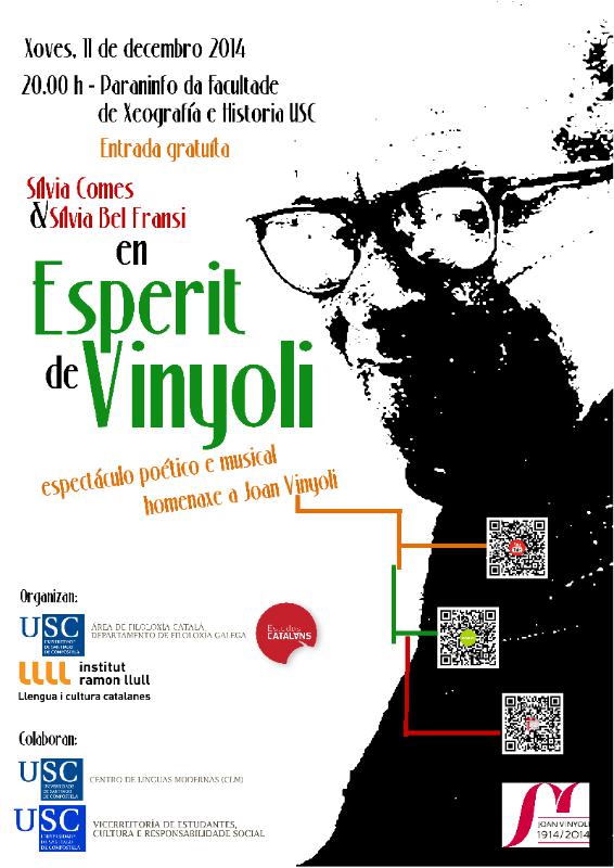 O Paraninfo da Universidade (Facultade de Xeografía e Historia) acolle este xoves 11 unha homenaxe poética e musical que conmemora o centenario do nacemento e os trinta anos da morte de Joan Vinyoli (Barcelona, 1914-1984), un dos poetas cataláns máis brillantes e influentes do século XX e que foi traducido ao galego nunha antoloxía por Luciano Rodríguez. No espectáculo ‘Esperit de Vinyoli’ os versos do autor catalán cobrarán vida ás 20.00 horas interpretados pola cantautora Sílvia Comes e a poeta Sílvia Bel Fransi, que propoñen unha ruta centrada nun repertorio de poemas que falan sobre algunhas das temáticas principais de Vinyoli: o amor, o paso do tempo, a soidade e a morte.