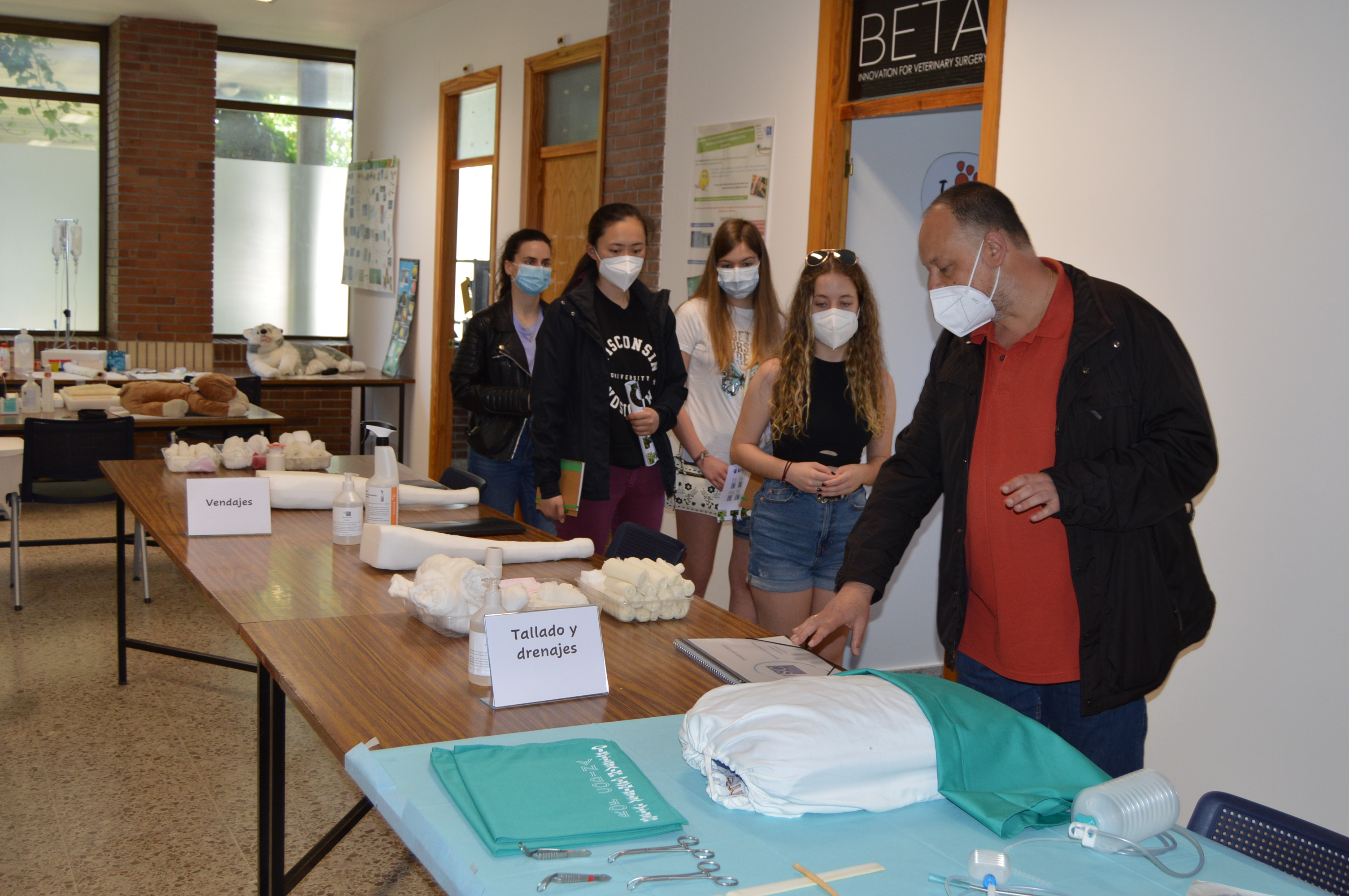 Luis Quintela, con catro alumnas preuniversitarias, no laboratorio de habilidades clínicas veterinarias