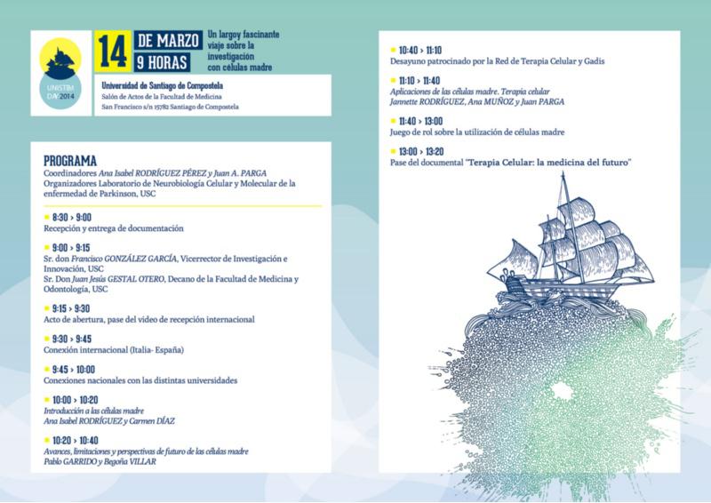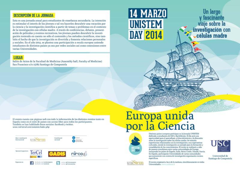 Preto de 250 estudantes de seis centros de secundaria de Compostela coñecerán de primeira man as particularidades da investigación con células nai, dende os conceptos básicos e aplicacións actuais ata as limitacións para a súa aplicación e manexo. Estes son os contidos das xornadas Unistem Day 2014 cuxa celebración se desenvolve simultaneamente este venres 14 en 45 universidades europeas de Irlanda, Reino Unido, Suecia, Italia e España coa participación de máis de 20.000 estudantes de secundaria. A Facultade de Medicina da USC é un dos seis centros que acollen esta iniciativa en España. A xornada brinda unha oportunidade para a aprendizaxe, o descubrimento e o debate sobre a investigación con células nai, así como para a reflexión sobre as expectativas que suscitan estes estudos. Preténdese estimular o interese e as vocacións dos máis novos pola investigación científica a partir do coñecemento destas células e mostrarlles as liñas de investigación que se realizan dende a USC. A participación española complétase coas achegas das Universidades de Barcelona, Murcia, Valladolid, Autónoma de Madrid e Autónoma de Barcelona. O encontro realízase no marco da Rede de Terapia Celular e está coordinado polo investigador da Facultade de Medicina da UB, Josep M. Canals. En Compostela, o vicerreitor de Investigación e Innovación, Francisco González, e o decano da Facultade de Medicina, Juan Gestal, darán a benvida ás 9.00 horas aos participantes á xornada que se desenvolverá no Salón de Actos da Facultade. Logo dunha serie de conexións coas outras universidades nacionais participantes así como con centros de Italia, comezarán as charlas cunha sesión introdutoria ás células nai que impartirán Carmen Díaz Ruiz e Ana Isabel Rodríguez Pérez. Continuarán a quenda de intervencións Pablo Garrido e Mª Begoña Villar Cheda falando dos ‘ Avances, limitacións e perspectivas de futuro das células nai’ e Jannette Rodríguez Pallares, Ana María Muñoz Patiño e Juan Parga Martín para referirse á terapia celular. Xogo de rol Entre as actividades que se realizarán, os/as estudiantes de secundaria participarán nun xogo sobre o uso das células nai no que se deberán completar as fases que segue unha delas para a rexeneración dun óso ou ordenar cartas de pistas para construír o proceso que experimenta unha destas células no seu desenvolvemento. O xogo deseñárono Mónica Pardo e Gerardo García, investigadores do Departamento de Bioloxía Celular, Inmunoloxía e Neurociencias da Universidade de Barcelona.