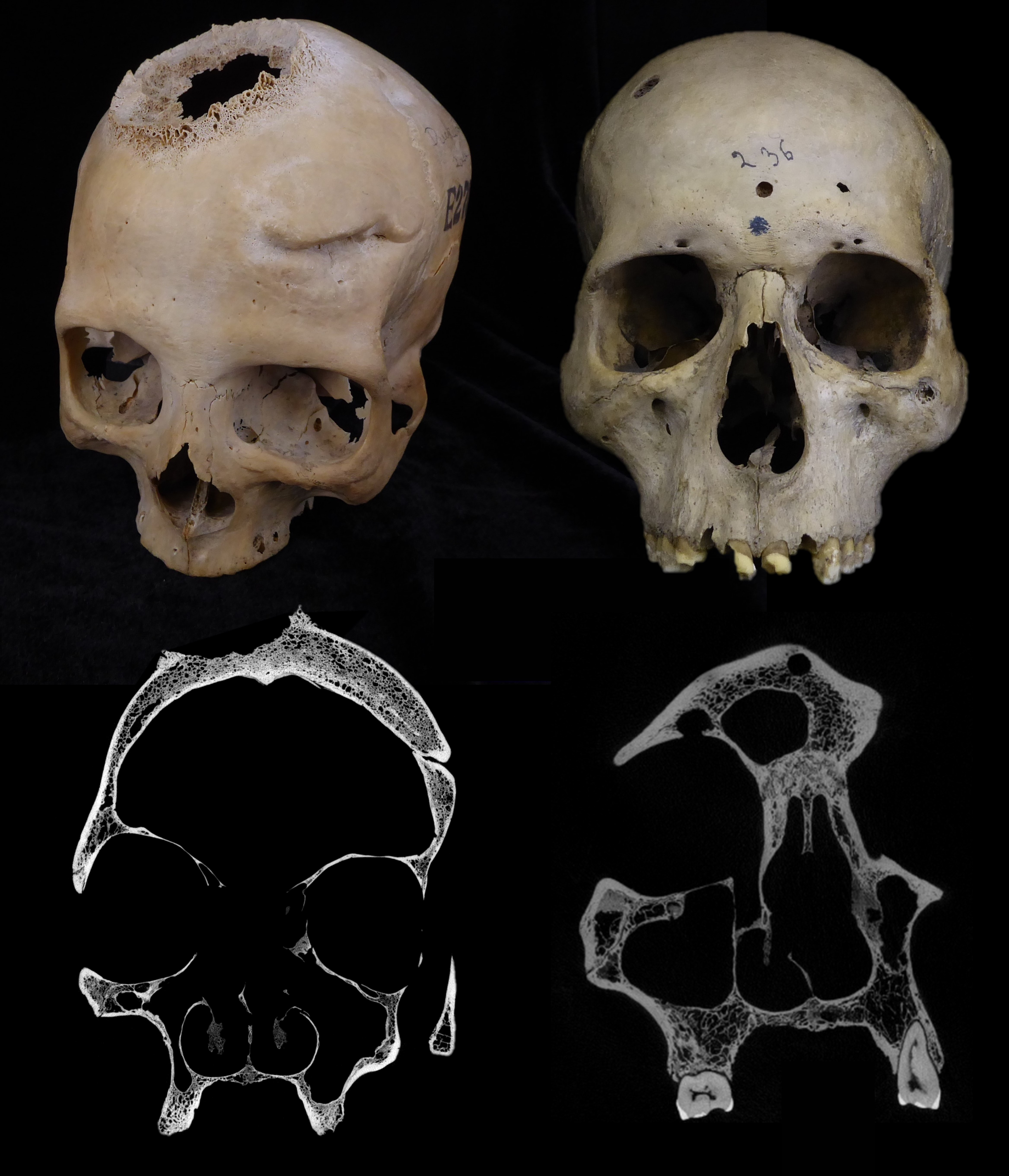 No cranio 236, a observación microscópica mostrou unha lesión de gran tamaño consistente cunha destrución excesiva do tecido, unha enfermidade coñecida como neoplasia. Ademais, hai unhas 30 lesións metastásicas pequenas e redondas espalladas polo cranio.