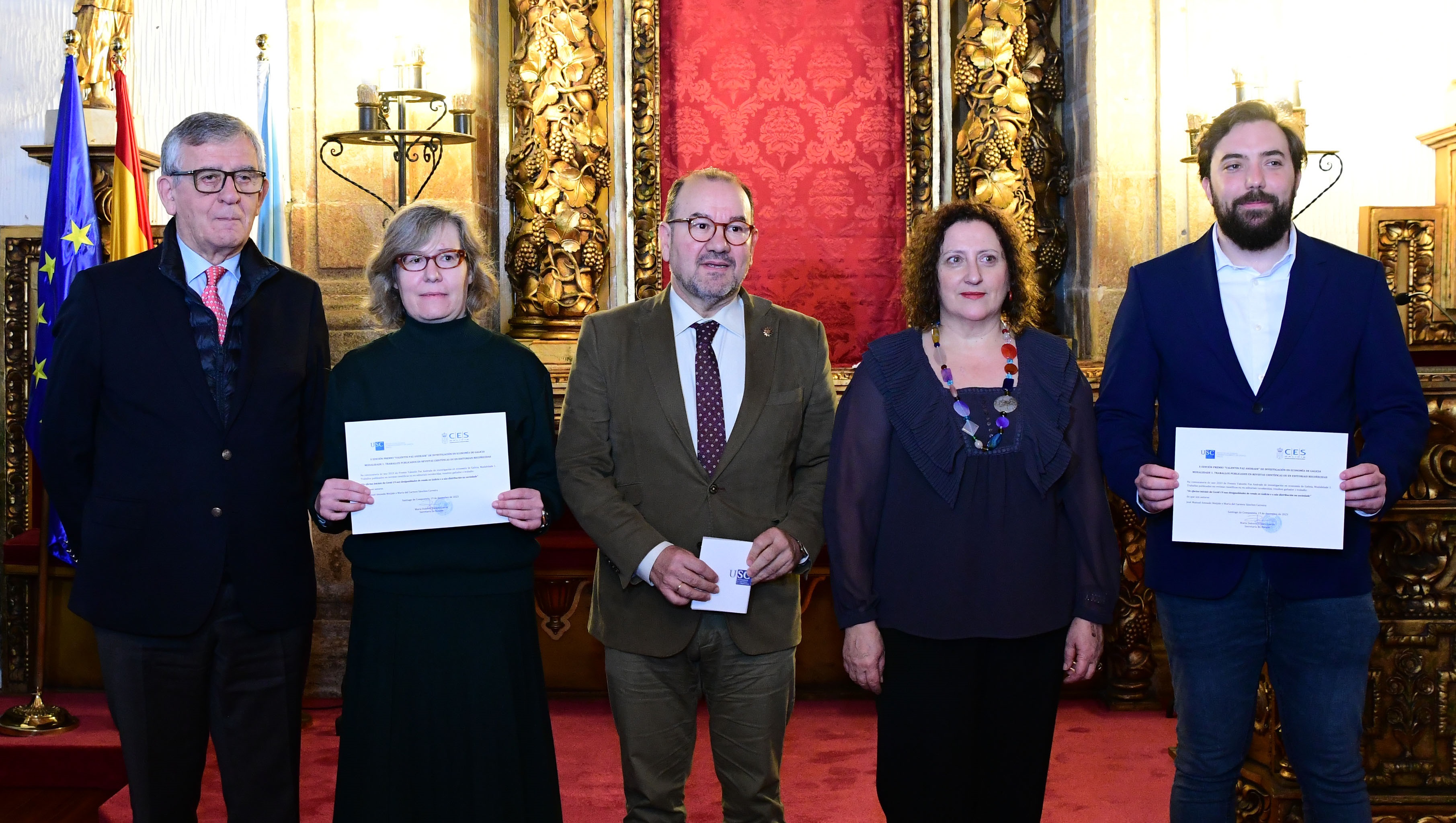 José Manuel Amoedo e María del Carmen Sánchez-Carreira recolleron este martes 23 o premio Valentín Paz Andrade de Investigación en Economía de Galicia, convocado polo Instituto de Estudos e Desenvolvemento de Galicia da USC (IDEGA) e o Consello Económico e Social (CES). Amoedo e Sánchez-Carreira foron premiados polo artigo ‘Os efectos iniciais da COVID-19 nas desigualdades de renda en Galicia e a súa distribución na sociedade’, un traballo que veu a luz na Revista Galega de Economía.