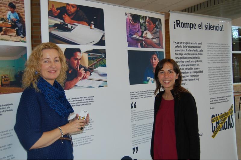 A directora da Escola de Enfermaría Mª Asunción Núñez Magdalena e María Díaz, representante de Médicos Sen Fronteiras, ante os paneis da mostra inaugurada