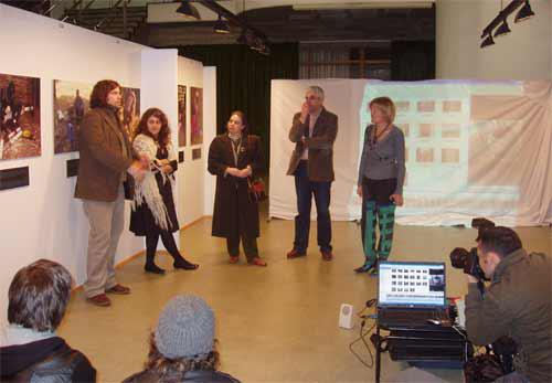 O fotógrafo Xurxo Ayán e a organizadora da exposición Sonia García (primeiros pola esquerda) na inauguración da mostra ‘Onde as rúas non teñen nome’