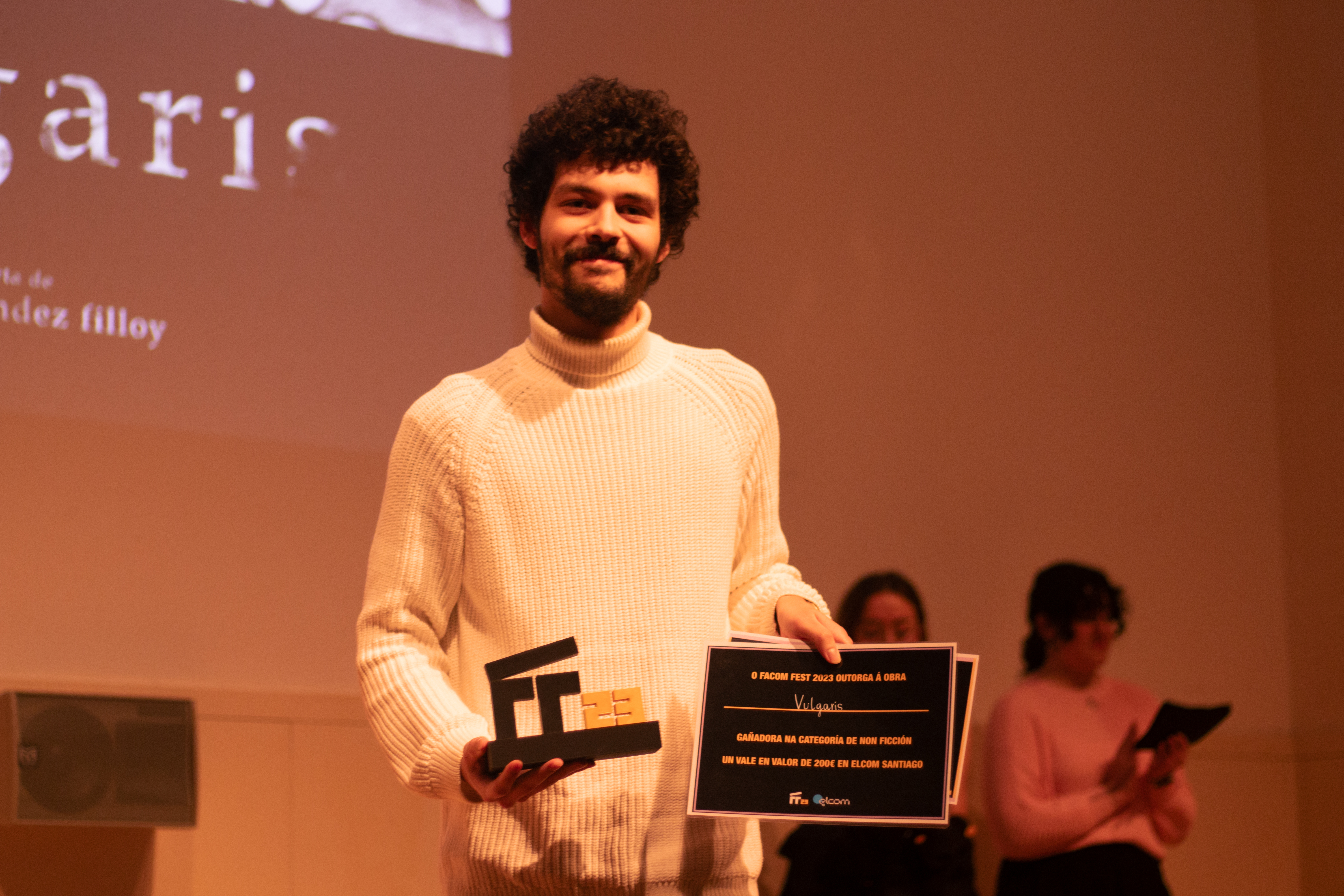 Despois de catro días completos nos que o público puido asistir ás exhibicións das obras e participar en coloquios e actividades, este xoves 30 déronse a coñecer nunha gala as pezas gañadoras da segunda edición do Facom Fest, o festival de cine do estudantado galego. Os equipos das obras premiadas recibiron os seus premios en presenza dos xurados profesionais e novos do festival, da vicerreitora de Cultura e Estudantes da USC, Pilar Murias, e do numeroso público reunido no auditorio da Facultade de Ciencias da Comunicación, nun evento amenizado pola actuación da cantante Gloria Pavía xunto ao baixista Rafa Morales. O Facom Fest pecha o ciclo de actividades culturais desenvolvidas co apoio das axudas destinadas ao desenvolvemento de proxectos de dinamización físico-deportiva e cultural nos centros da USC, que promove a Vicerreitoría de Estudantes e Cultura e das que en breve sairá unha nova convocatoria.