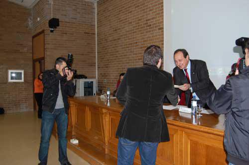 Carlos Herrero, vicerreitor de Coordinación de Campus de Lugo entrega o primeiro premio 'comunicándomos' a un spot sobre os malos tratos