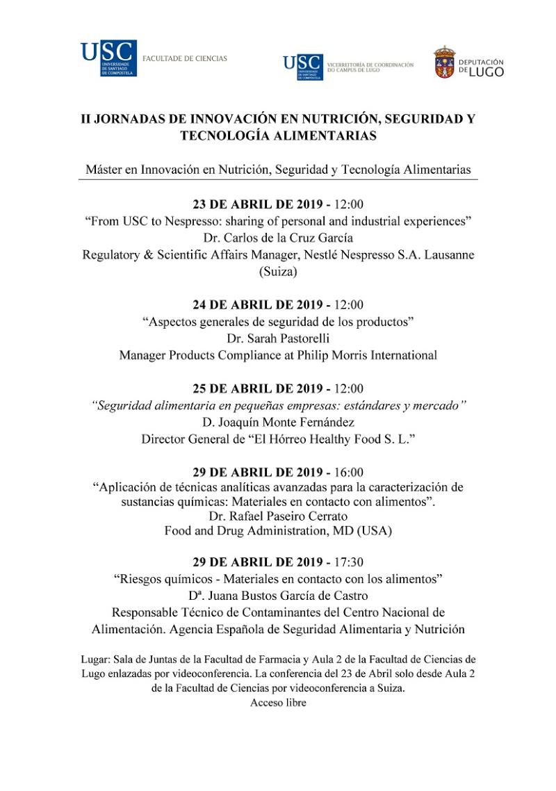 A Facultade de Ciencias do campus de Lugo da USC acolle esta semana a cuarta edición das Xornadas de Innovación en Nutrición, Seguridade e Tecnoloxías Alimentarias, un ciclo de relatorios promovido desde o Mestrado en Innovación, Nutrición, Seguridade e Tecnoloxía Alimentarias que bota a andar este martes que se prolongará ata o 29 de abril. As distintas sesións programadas no marco deste foro poderán seguirse tanto na aula 2 do centro universitario lugués como na sala de xuntas da Facultade de Farmacia de Santiago de Compostela.