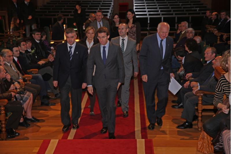 Preto de 3.000 titulados/as, 367 teses defendidas, liñas de colaboración abertas co CERN, coa Axencia Espacial Europea, co Observatorio Pierre Auger, con universidades de Francia, Alemaña e Gran Bretaña son algúns dos indicadores que definen o dinamismo da Facultade de Física da USC nos seus primeiros 30 anos de existencia. Este aniversario do centro compostelán foi obxecto dun acto conmemorativo celebrado este venres no Colexio de Fonseca baixo a presidencia do titular da Xunta de Galicia, Alberto Núñez Feijóo, acompañado do reitor Juan Casares; do decano da Facultade, Luís Miguel Varela Cabo; e da secretaria do centro, Elena López Lago. Na sesión, que comezou cunha descrición da evolución histórica do centro, o profesor Varela Cabo apelou ao afianzamento dun sistema de ciencia e tecnoloxía forte para contrarrestar unha situación que semella “un longo pesadelo”. Para conseguir ese sistema, o decano demandou da administración autonómica unha especial atención dos axentes implicados, a definición de prioridades estratéxicas e un financiamento adecuado. Varela Cabo afirmou ter “problemas para reter ao persoal” en boa medida “pola seca de recursos” o que transcende a moitas liñas de investigación estratéxicas. A reivindicación de Luís Miguel Varela incluía tamén unha referencia ás “instalacións obsoletas” no eido da Física, para o que demandou apoio para alcanzar un centro singular que permita soster o desenvolvemento das múltiples liñas de traballo neste eido. Varela Cabo puxo o exemplo doutras economías nas que a inversión en I+D se sitúa arredor do 1 ou do 2 por cento para asegurar que “hai que investir no que é rendible para o futuro”, que concretou na docencia e na investigación. Nesta mesma liña e apelando á necesidade de consolidar a posición nacional e internacional que se ten alcanzado nos últimos anos, o decano tamén incidiu en que a fortaleza do sistema de ciencia e tecnoloxía descrito “non debe renunciar á investigación básica” como tampouco se debe discriminar outras áreas de coñecemento. Logo destes primeiros trinta anos de historia “seguiremos mirando cada ao futuro e se dispoñemos dos medios necesarios seguiremos acadando novos logros para que a ciencia progrese e á súa vez impulsar á industria”, concluíu. “Hoxe estar aquí ten un sentido que vai máis alá dunha cifra, dunha referencia histórica da Universidade” sinalou o reitor animando aos integrantes do centro a sentirse satisfeitos “por tanto feito en tan pouco tempo”. Casares deu o relevo ao presidente da Xunta de Galicia para quen a Facultade de Física é un bo exemplo da misión da educación universitaria na formación das persoas. Buscando paralelismos coa ciencia física, a partir dunha metáfora segundo a que a economía se está a comportar como a enerxía escura, Feijóo sinalou que a política en economía non se debe precipitar. “Todos deberíamos buscar un resultado útil, útil de verdade”, e neste sentido “non é tempo para improvisar”, dixo. Lembrando que “se non fose polos físicos non teríamos o actual nivel sanitario”, o titular da Xunta aposta por que do coñecemento se deriven aplicacións prácticas, porque “a investigación ten que ser posta en valor polo tecido produtivo” e que as empresas vexan rendible o apoio á universidade. Conferencia de Antonio Hernando