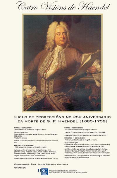 Cando se cumpren 250 anos da morte do compositor de orixe alemán Georg Friedrich Händel, a Facultade de Xeografía e Historia a través da Área de Música do seu Departamento de Historia da Arte quere renderlle unha homenaxe co ciclo de proxeccións comentadas ‘Catro visións de Haendel’, algunhas delas de difícil localización na actualidade.
