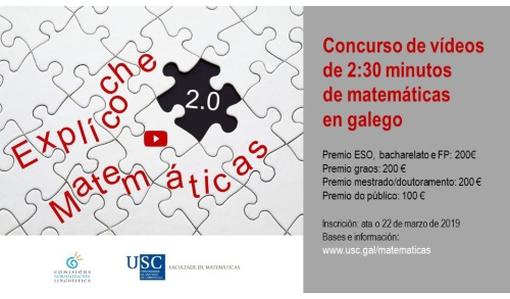 Logo de oito edicións, o certame audiovisual ‘Explícoche Matemáticas 2.0’ compila un total de douscentos vídeos realizados por alumnado universitario e de ensino medio. Todos as candidaturas presentadas a concurso procuran rigor matemático, corrección lingüística, capacidade técnica e, sobre todo, creatividade e orixinalidade por parte dos autores para explicaren conceptos matemáticos en lingua galega, segundo indicaron os membros do xurado.