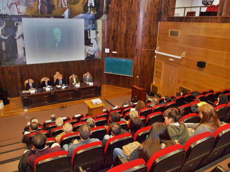 A Facultade compostelá de Química homenaxeou este mércores 12 ao que fora pai da Química moderna en Galicia, Antonio Casares, no ano en que se cumpren douscentos anos do seu nacemento. O acto, presidido polo reitor Juan Casares, comezou co descubrimento dunha placa conmemorativa na Aula Magna do centro en honra do profesor, que a partir de agora dará nome a ese espazo. No descubrimento estiveron presentes as decanas e decanos das facultades que promoven a celebración do Ano Casares Rodríguez na USC, como son Física, Bioloxía, Medicina, Farmacia, Matemáticas e Química. A seguinte etapa da sesión foi a presentación do libro sobre Antonio Casares editado para a ocasión por Ensinantes de Ciencias de Galicia (ENCIGA) e que contou coa presenza do presidente deste colectivo, Paulino Estévez Alonso. A continuación, o catedrático do Departamento de Química Inorgánica da USC, Manuel Rafael Bermejo Patiño, pronunciou a conferencia ‘Antonio Casares como químico’. Xunto ao reitor, tamén estiveron presentes o decano da Facultade de Química, Ramón Estévez Cabana, e o decano do Colexio de Químicos de Galicia, Antonio Macho Senra. Científico pioneiro Antonio Casares, que foi reitor da USC entre 1772 a 1888, foi un científico innovador pioneiro cunha importante achega científica en moi variados campos, non só na Química. Así, destacan os seus traballos en espectroscopía, análise de augas e viños, anestésicos ou ditames periciais, ademais de ser quen descubriu os minerais Morenosita e Zaratita, o primeiro que xerou luz eléctrica en España (nun experimento realizado no claustro da Facultade de Xeografía e Historia) e quen montou o primeiro observatorio meteorolóxico de Galicia. De dereita a esquerda: Ramón Estévez, Juan Casares, Mª Victoria Otero, Manuel Bermejo, Mª Isabel Sandez, Juan Gestal, Mª Luz González Caamaño e Luis M. Varela Cabo. Foto: Alfonso-Servimav Na presentación do libro interviron, de esquerda a dereita, Paulino Estévez, Ramón Estévez, Juan Casares, Antonio Macho e Manuel Bermejo. Foto: Alfonso-Servimav