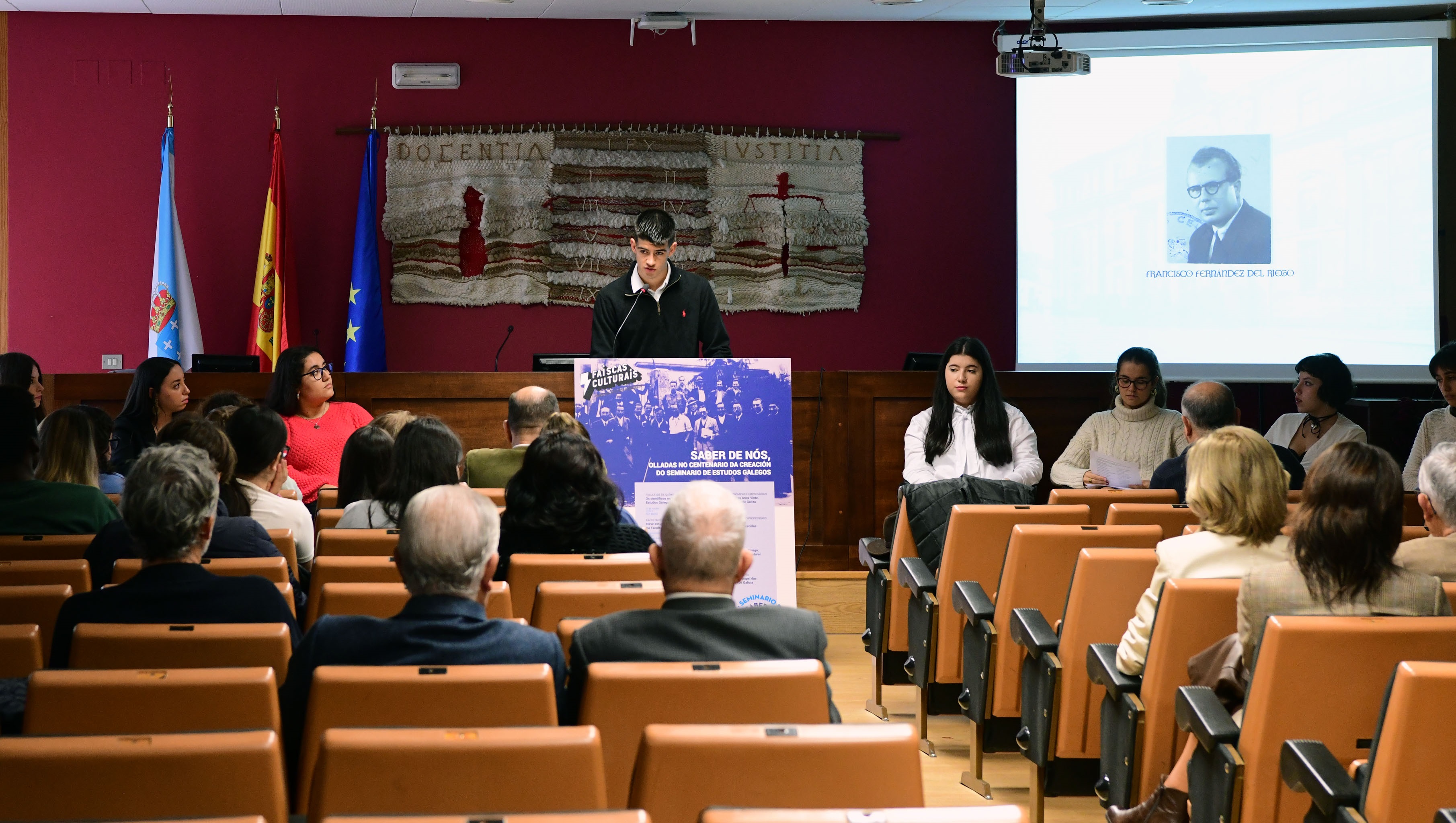 A posta en escena que alumnado de Dereito desenvolveu este venres 27 dando lectura a diversos textos e personificando os integrantes do Seminario de Estudos Galegos (SEG) constituíu a segunda Faísca Cultural deste curso 2023-2024. A través destas intervencións coas que se rende tributo ao SEG, a USC quere prender a reflexión cultural e complementar a formación do estudantado a través de actividades que se sitúan na intersección entre o coñecemento académico e a expresión artística. O reitor Antonio López e a decana Ana Gude acompañaron o estudantado nesta posta en escena que coincide coa estadía no centro da mostra itinerante ‘Saber de Nós. Unha ollada ao centenario da creación do Seminario de Estudos Galegos’, comisariada por Henrique Monteagudo.