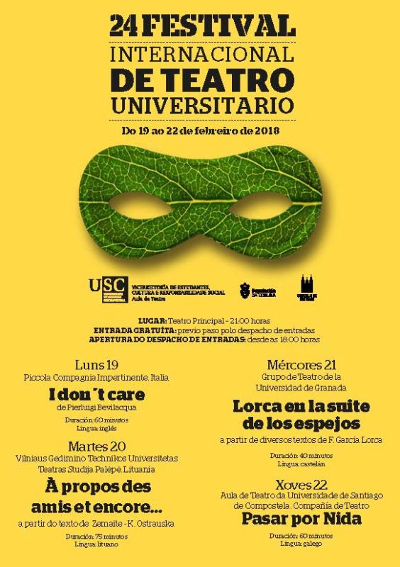 O mércores 21 será a quenda do Grupo de Teatro da Universidade de Granada que presentará ‘ Lorca en la suite de los espejos’, unha produción de 40 minutos que parte de diversos textos do poeta. Finalmente, a Aula de Teatro da USC representará o xoves 22 ‘Pasar por Nida’, obra de 60 minutos en galego. Este Festival conta co respaldo da Vicerreitoría de Estudantes, Cultura e Responsabilidade Social da USC, da Deputación da Coruña e do Concello de Santiago.