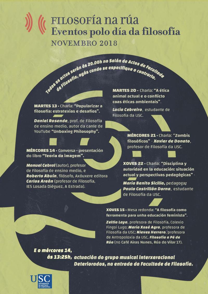 Filosofía inicia este martes 20 a segunda semana de actividades organizadas con motivo da celebración do Día Mundial da Filosofía, efeméride ao fío do que a facultade compostelá desenvolve por cuarto ano consecutivo unha serie de iniciativas co lema ‘Filosofía na rúa’ organizadas por estudantado e profesorado do centro. O propósito deste evento é difundir a importancia da reflexión sobre os problemas actuais e as cuestións máis fundamentais, en definitivo a relevancia da Filosofía.