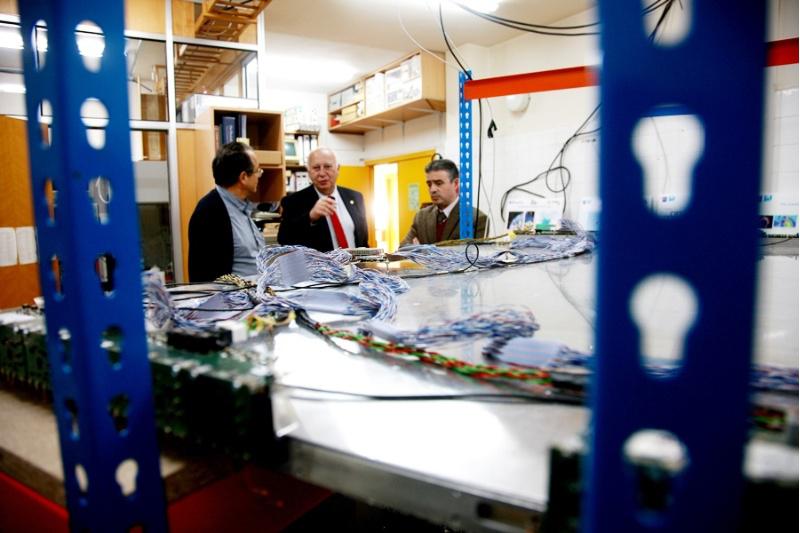 O reitor coñeceu os detalles do detector instalado na Facultade de Física da man do profesor Juan A. Garzón e do decano Luís Miguel Varela Cabo. Foto: Servimav-USC
