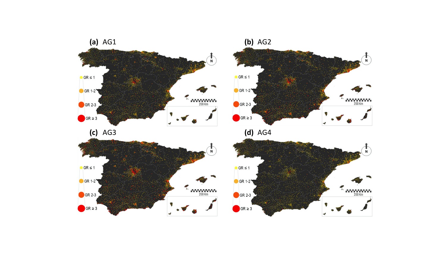Mapas que amosan, nun escenario sen restricións, o patrón que seguen as taxas de crecemento espacial. Os valores máis altos pertencen aos grupos de poboación nova (AG1) e activa (AG2 + AG3)