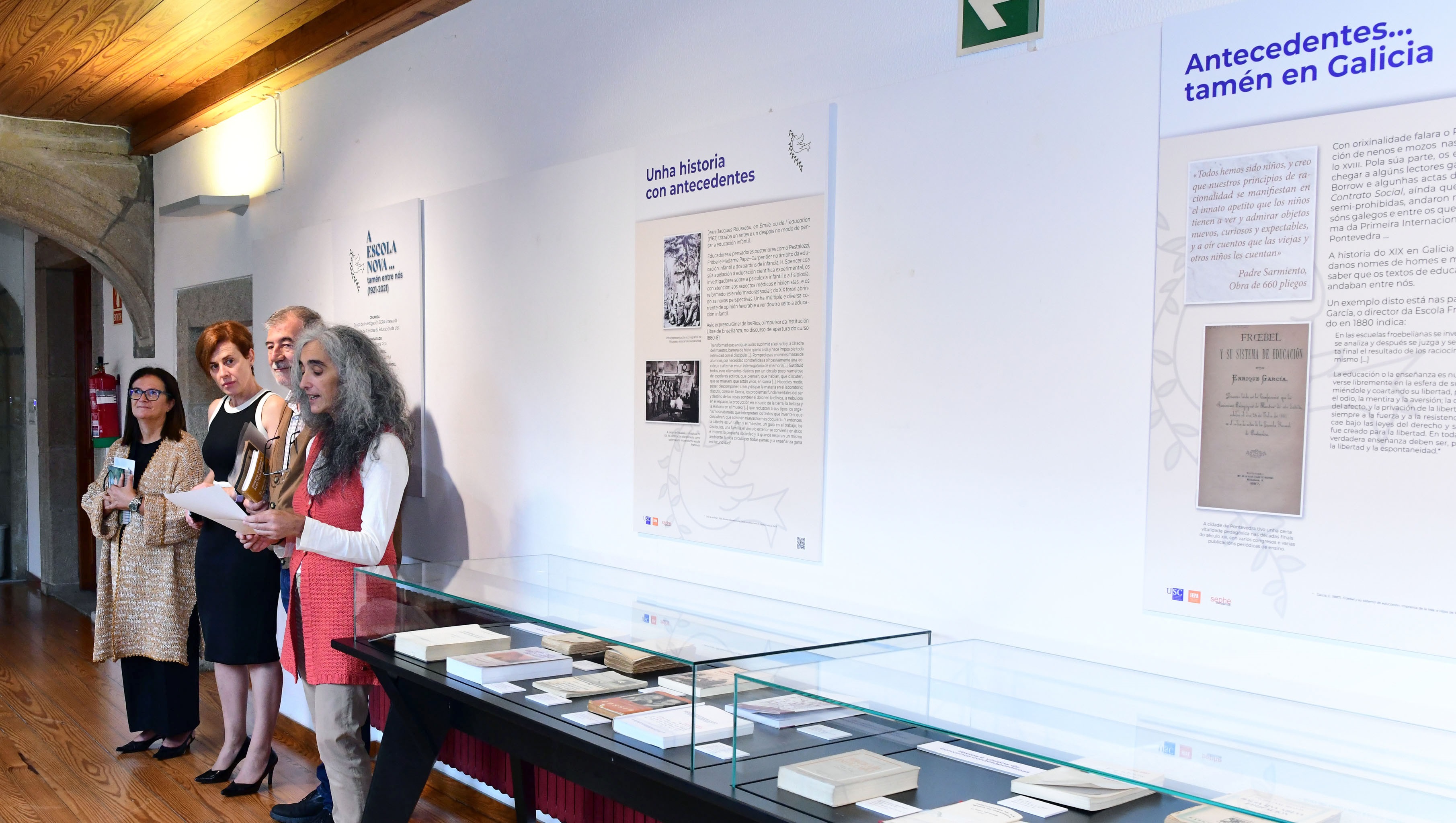 A exposición 'A Escola Nova... tamén entre nós (1921-2021)' salienta o valor patrimonial e histórico do movemento pedagóxico internacional da Nova Educación, desenvolvido por profesionais da educación, a medicina, a hixiene e a psicoloxía durante as catro primeiras décadas do século XX, en particular mediante as iniciativas da Liga Internacional da Educación Nova (LIEN). A mostra permitirá coñecer como as orientacións, propostas e iniciativas deste movemento marcaron o posterior desenvolvemento da educación a escala internacional ata a actualidade. No acto inaugural participaron a vicerreitora de Estudantes e Cultura, Pilar Murias; a decana da Facultade de Ciencias da Educación, Mar Lorenzo; a investigadora do grupo SEPA-Interea, Belén Caballo; e o profesor Antón Costa Rico, comisario da mostra xunto a Lucía Iglesias da Cunha.