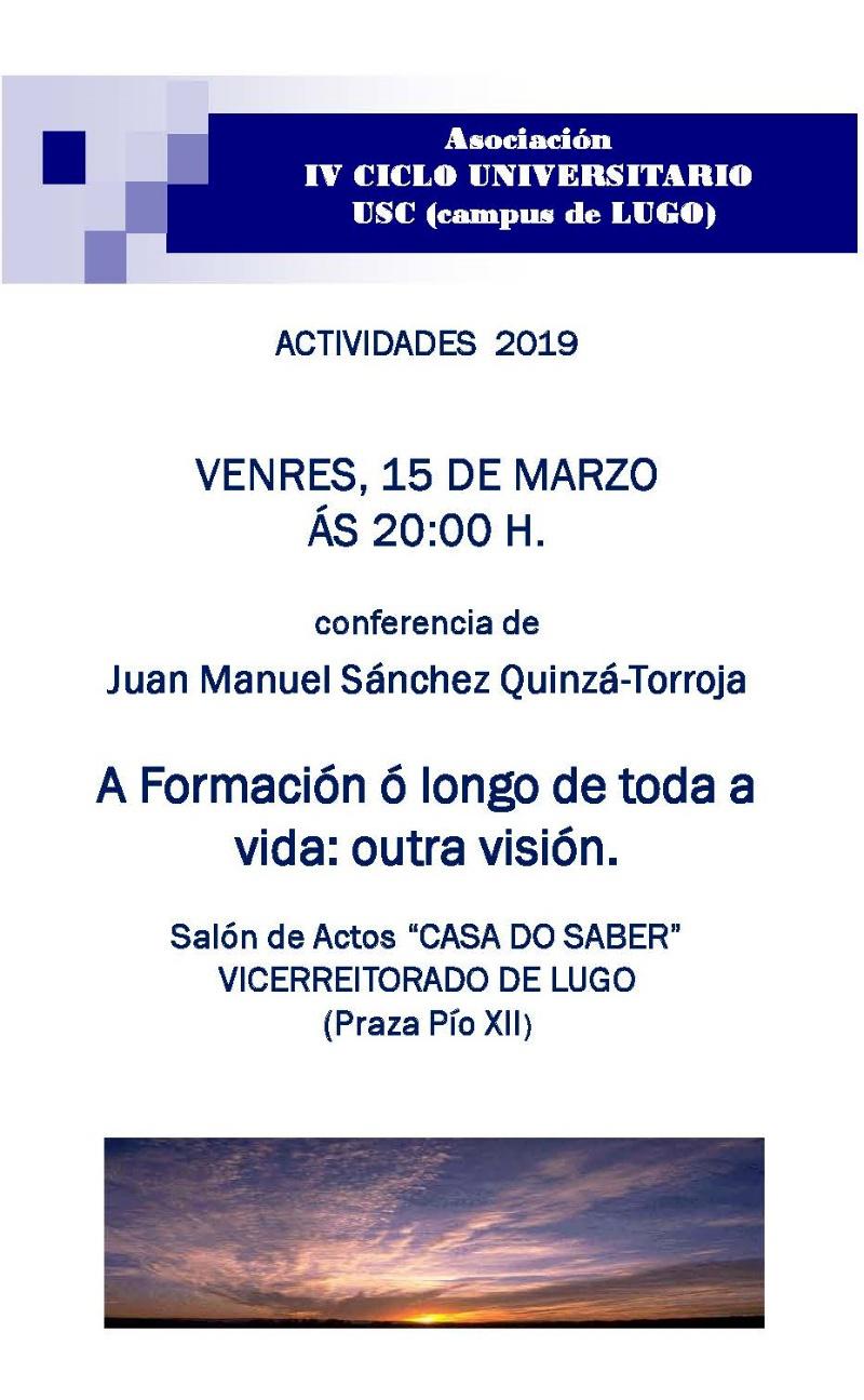 Quinzá-Torroja reflexionará na súa conferencia, organizada pola Asociación do IV Ciclo da USC do campus de Lugo, sobre a aprendizaxe ao longo da vida e especialmente afondará especialmente no discurso que antepón a parte economista da formación á formación integral das persoas e á posterior incidencia na transformación social.
