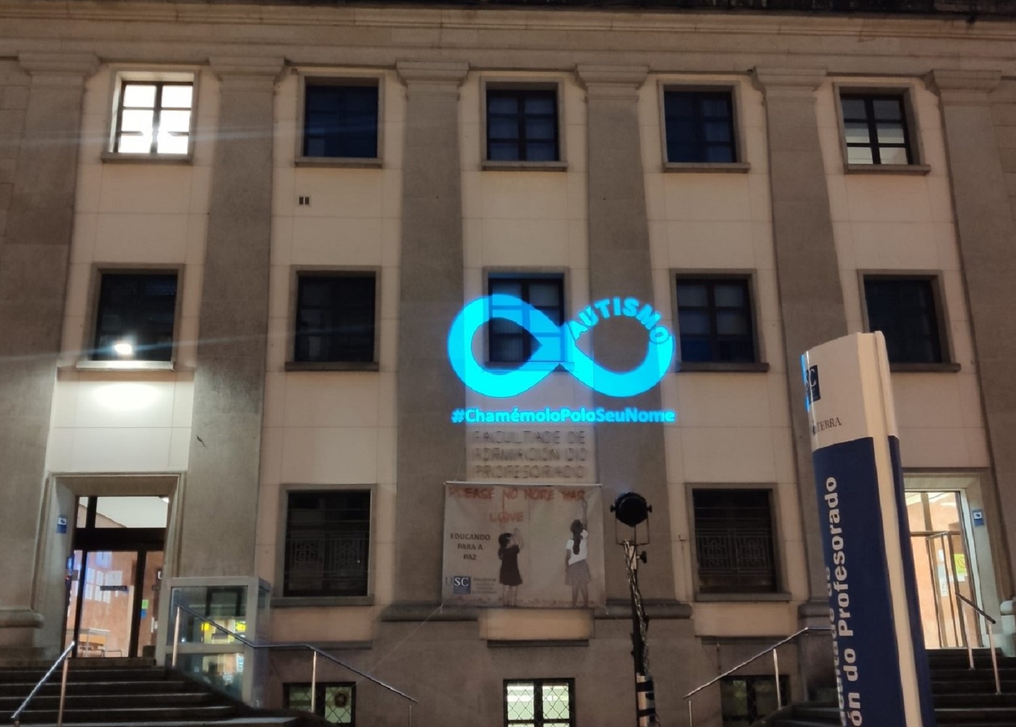 Un lazo luminoso de cor azul proxectado na fachada do centro universitario sobre o lema ‘Chamémolo polo seu nome’ sensibiliza sobre a necesidade de favorecer a integración social e a igualdade de oportunidades das persoas con autismo