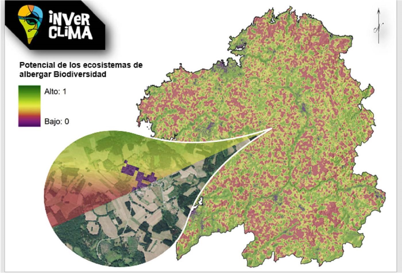 O labor de identificación e posterior mapeo de espazos naturais cunha biodiversidade acaída para a provisión sostible de recursos ecosistémicos centrou o traballo desenvolvido nos últimos meses ao abeiro do proxecto Inverclima. Esta actuación está a piques de chegar ao seu colofón logo da realización do mapeo de toda Galicia. Os documentos elaborados son o resultado da análise das potencialidades dos ecosistemas galegos para acubillar biodiversidade e para proveer recursos ecosistémicos.