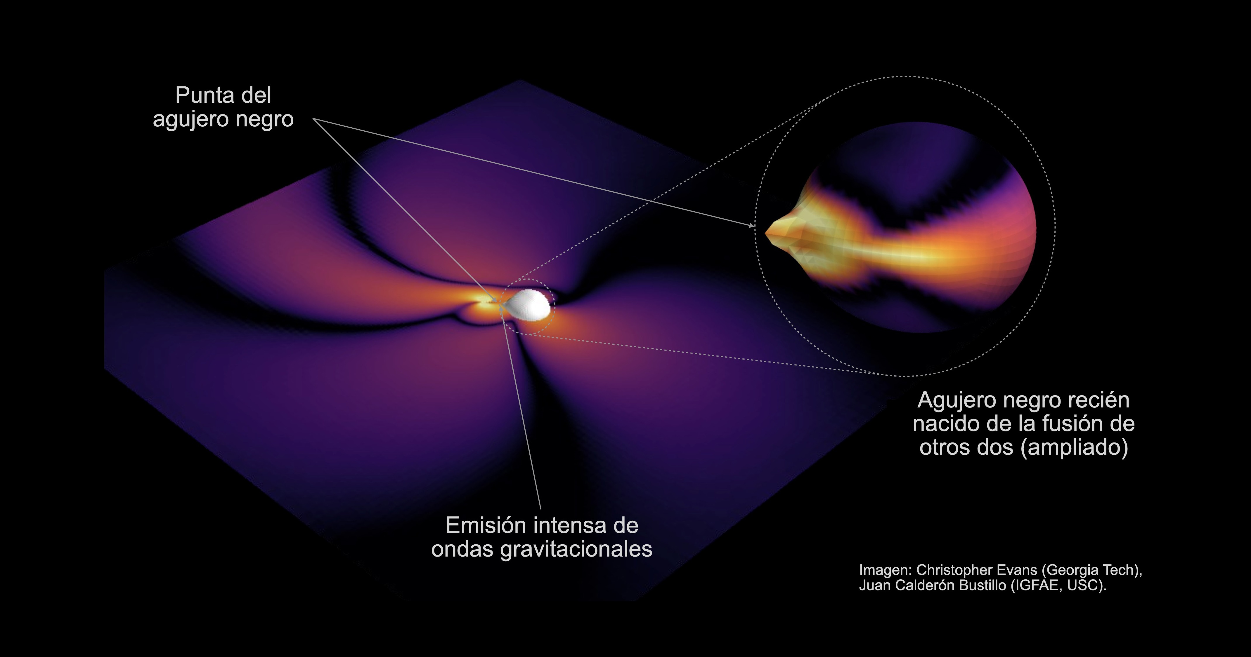 Un equipo de astrónomos, liderado polo investigador de ondas gravitacionais do Instituto Galego de Física de Altas Enerxías (IGFAE) da USC, Juan Calderón Bustillo, acaba de revelar que cando dous buracos  negros se fusionan, o buraco negro remanente emite pulsos de ondas gravitacionais, similares ás dun faro, que permiten pescudar a súa forma. Este xoves a revista Communications Physics de Nature publica este traballo realizado en colaboración co Georgia Institute of Technology de Atlanta, e que evidencia como as ondas gravitacionais levan impresas a forma do buraco negro final.
