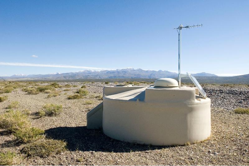 Detector Cherenkov de auga do Observatorio Auger na Pampa Amarilla, ao oeste de Arxentina. Foto: The Pierre Auger Observatory Representación artística dunha choiva de raios cósmicos cun detector Cherenkov de auga do Observatorio Pierre Auger no oeste de Arxentina. Foto: A. Chantelauze, S. Saffi, L. Bret
