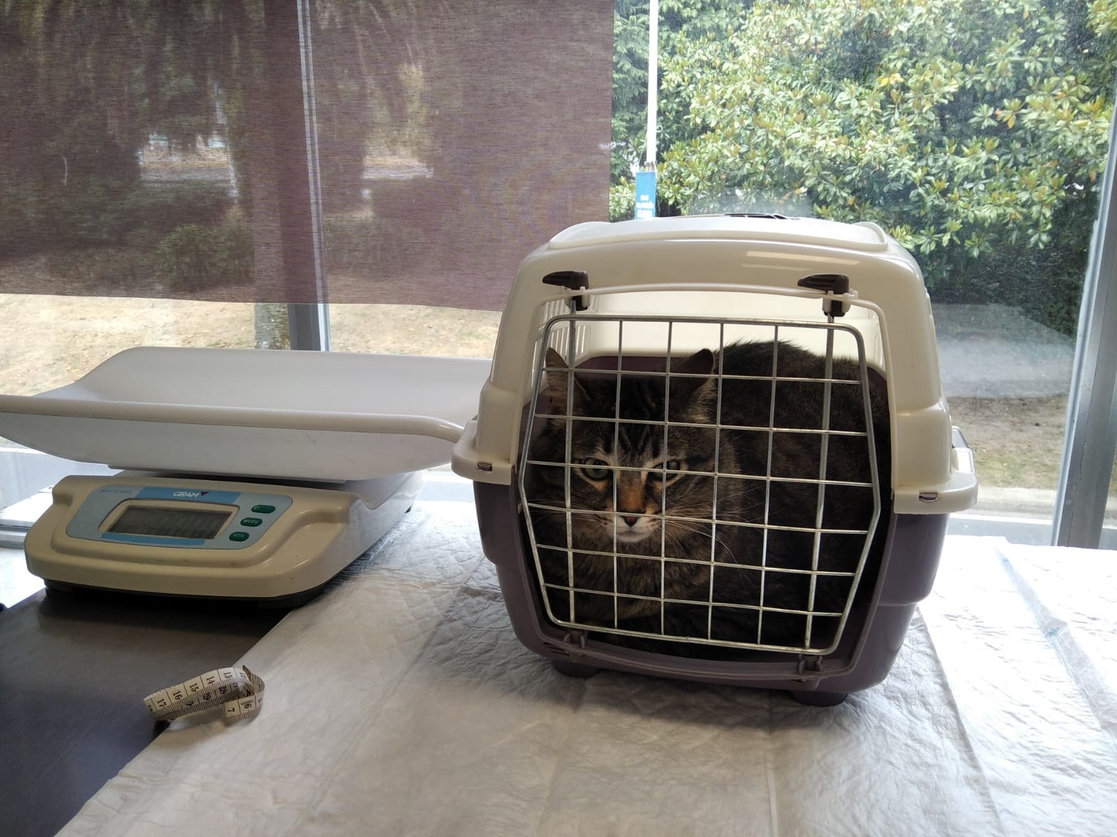 Un gato na súa gaiola, antes da súa revisión no hospital veterinario Rof Codina