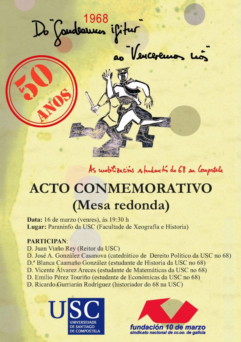 A Universidade de Santiago e a Fundación 10 de marzo conmemorarán este venres 16 os 50 anos das mobilizacións estudantís do 68 en Compostela. Farano nunha mesa redonda ás 19.30 horas no Paraninfo da Universidade (Facultade de Xeografía e Historia) na que intervirán testemuñas directas daquel movemento reivindicativo, que na USC se adiantaba un par de meses á revolta de maio en París.