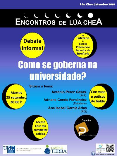 Os Encontros de Lúa Chea, un programa de debate sobre cuestións de actualidade organizado polo colectivo universitario Proxéctate en Galego, celebra este martes 25 de setembro, a partir das 20.00 horas, a primeira sesión do novo curso académico, un debate informal que se desenvolverá na cafetería da Escola Politécnica Superior de Enxeñaría do campus de Lugo, baixo o título ‘Como se goberna na universidade?’ A entrada é libre e de balde para todo o público interesado.