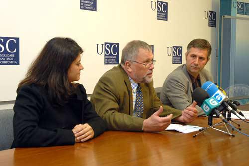 De esquerda a dereita: a secretaria executiva do Grupo Compostela, Beatriz Iglesias; o seu presidente, Michael Cooper; e o vicerreitor de Relacións Institucionais, Lourenzo Fernández