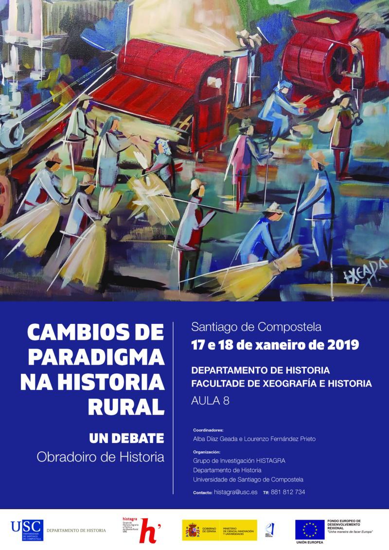 ‘Cambios de paradigma na Historia Rural. Un debate’ é o lema do obradoiro de Historia que a finais da vindeira semana organizan Alba Díaz Geada e Lourenzo Fernández Prieto, investigadores do grupo Histagra, a través do proxecto ‘Os vectores do cambio estrutural das agriculturas atlánticas ibéricas_moto-mecanización e especialización leiteira’. Esta acción formativa sobre o cambio de paradigma na historia rural celebrarase o xoves 17 en horario de 8.45 a 21.00 horas e o venres 18 de 9.00 a 13.00 horas na Aula 8 da Facultade de Xeografía e Historia.