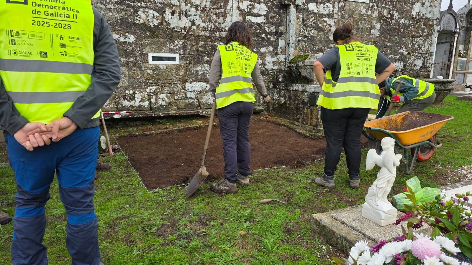 Logo de rematar en Rianxo, o grupo HISTAGRA da USC e do CISPAC trasladou este luns 10 os seus traballos ao concello de Teo para estudar e exhumar unha fosa da resistencia armada antifranquista emprazada no cemiterio da igrexa de Santa María de Luou na que se atopan os restos de catro membros da V Agrupación comandada por Benigno Andrade, o “Foucellas”.