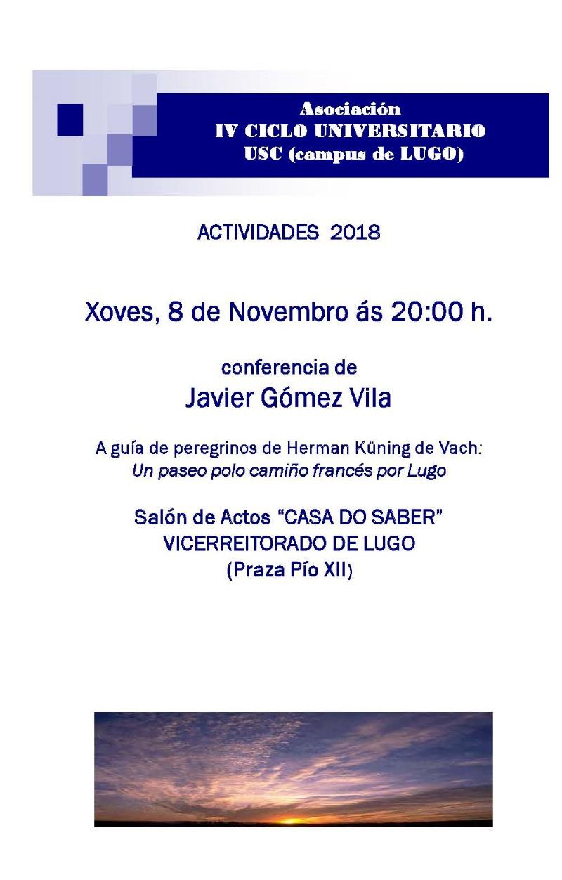 O doutor en Arqueoloxía e Historia pola USC e profesor no Ies Nosa Señora dos Ollos Grandes de Lugo Javier Gómez Vila ofrecerá este xoves, a partir das 20.00 horas, no auditorio da Casa do Saber de Lugo, o relatorio ‘A guía de peregrinos de Herman Küning de Vach: Un paseo polo camiño francés por Lugo’.