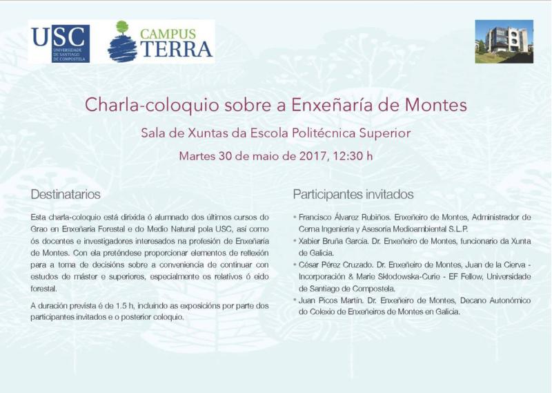 A Escola Politécnica Superior do Campus Terra da USC celebra este martes, a partir das 12.30 horas, un coloquio sobre o horizonte profesional e laboral da Enxeñaría de Montes, no que intervirán como catro relatores.