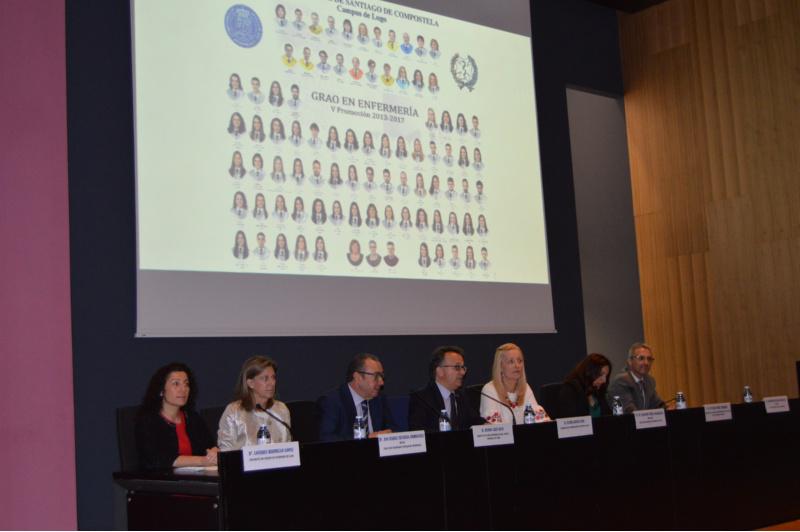 A cerimonia de graduación desenvolveuse no marco dunha sesión aberta á á participación das familias e na que tamén interviñeron como relatores o xerente de Xestión Integrada de Lugo, Cervo e Monforte, Ramón Ares Rico; a directora da escola universitaria de Enfermaría, Mª Asunción Núñez Magdalena; a directora de Procesos de Enfermaría da EOXI Lugo, Cervo e Monforte, Mª Jesús Pérez Taboada; a decana da Facultade de Enfermaría de Santiago de Compostela, Ana Silveira Rodríguez; a presidenta do Colexio de Enfermaría de Lugo, Lourdes Bermello López, e o profesor da Escola Universitaria de Enfermaría de Lugo Rosendo Bugarín González, en calidade de padriño desta promoción de novos graduados