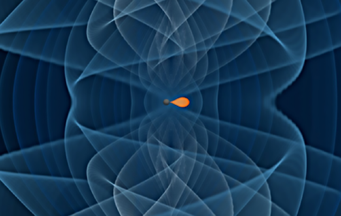 A imaxe amosa a fusión dun burato negro de baixa masa (en gris escuro) cunha estrela de neutróns. O sinal de ondas gravitacionais aparece representado cun rango de cores que van desde o azul escuro ao máis claro. ILUSTRACIÓN: I. Markin (Universidade de Potsdam), T. Dietrich (Universidade de Potsdam e Instituto Max Planck de Física Gravitacional), H. Pfeiffer, A. Buonanno (Instituto Max Planck de Física Gravitacional)