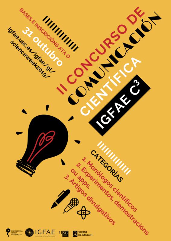 O Instituto Galego de Física de Altas Enerxías (IGFAE) abre ata o vindeiro 31 de outubro, a inscrición no II Concurso de Comunicación Científica, a primeira das súas actividades organizadas no marco da Semana da Ciencia que terá lugar entre o 11 e o 15 de novembro. O obxectivo deste concurso é promover a cultura científica da cidadanía e, en particular, fomentar o interese pola Física, estimulando a aprendizaxe dos seus fundamentos.