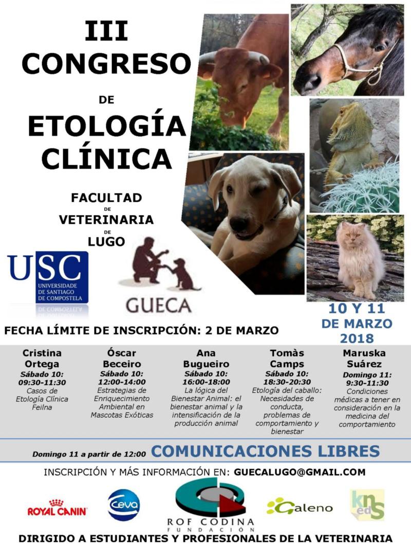 O programa vespertino deste congreso sobre etoloxía clínica, en cuxa organización tamén colaboran coa asociación estudantil Gueca Lugo, a Fundación Rof Codina e a USC, así como empresas, tales como Royal Canin, Ceva, Galeno e KNS edicións, comezará cunha exposición da investigadora veterinaria Ana Bugueiro, quen tratará a lóxica do benestar animal, así como a incidencia deste parámetro na mellora da súa produción. A última das sesións programadas o sábado abordará o comportamento dos équidos e estará guiada por Tomás Camps, que tratará cuestións relativas ao comportamento dos cabalos, tanto as ligadas a necesidades de conduta, como a problemas de comportamento e benestar.