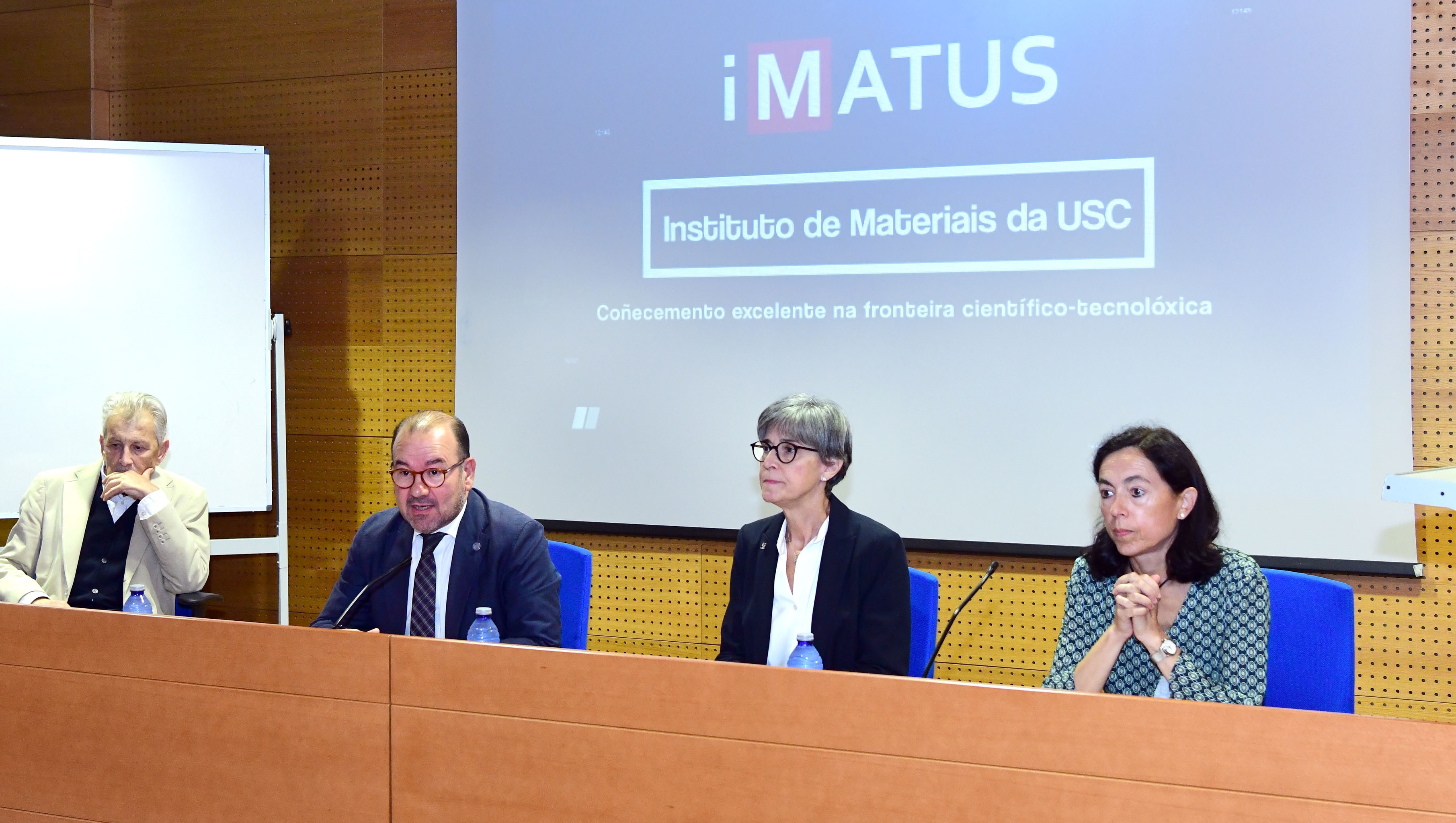 Carmen Álvarez, directira do iMATUS, acompañou o reitor na sesión de apertura na que tamén participaron o profesor da USC Francisco Guitián —quen tamén disertou xunto a Jaime Franco sobre a síntese e conformación de biocerámicas de fosfato Ca—, e a delegada do CSIC en Galicia e profesora de investigación do Instituto de Investigacións Mariñas, Carmen González Sotelo.