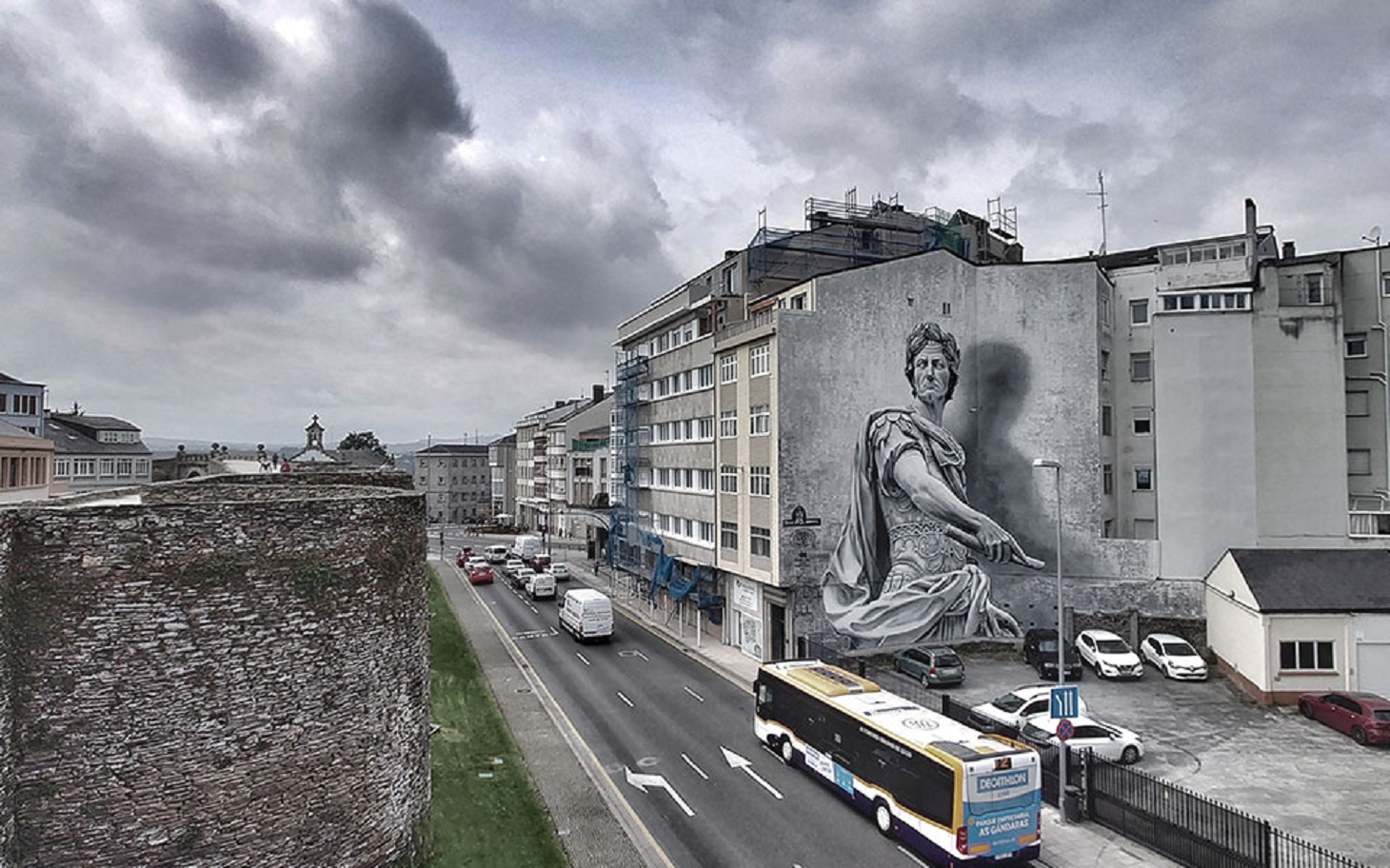 Mural de Xulio César, a carón da muralla romana de Lugo. Foto: Diego As