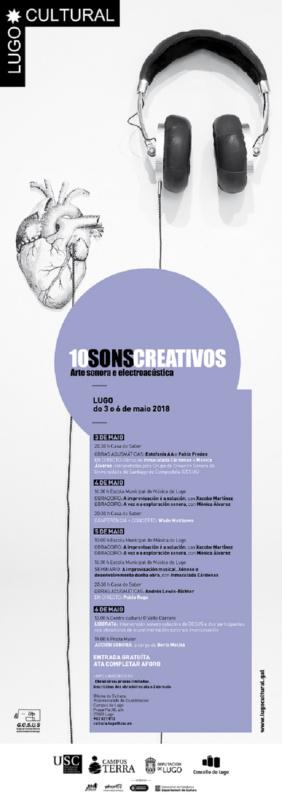 Os 10Sonscreativos’, un programa organizado ao abeiro do convenio Lugo Cultral e impulsado desde os seus comezos polo Grupo de Creación Sonora da USC (GCSUS), constitúe unha decidida aposta por difundir e achegar ao público dúas formas de creación sonora pouco habituais, tales como son a improvisación musical e a exploración sonora.