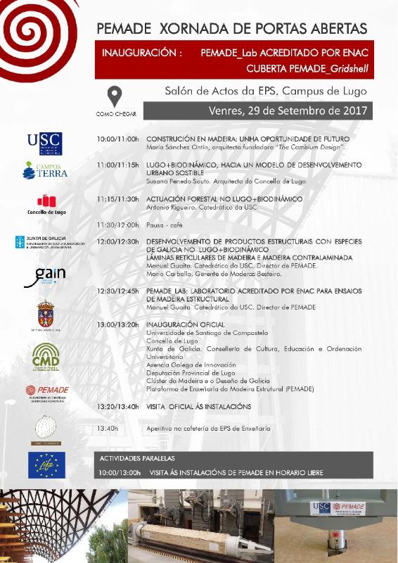 A Escola Politécnica Superior de Enxeñaría do Campus Terra da USC acollerá este venres unhas xornadas de portadas abertas orientadas a dar a coñecer as instalacións da e a oferta de servizos da Plataforma de Madeira Estrutural (Pemade), así como do seu laboratorio, o Pemade_Lab, que vén de ser acadar a acreditación da ENAC para a realización de ensaios de madeira estrutural, e da cuberta Gridshell, unha singular estrutura de madeira realizada en madeira de eucalipto e instalada no frontal sur do edificio da ampliación da EPS de Enxeñaría de Lugo.