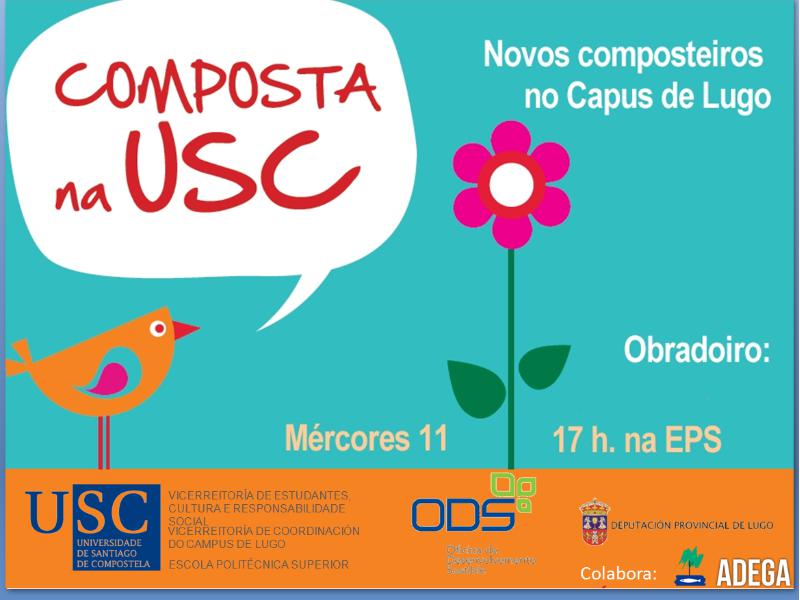 Esta acción, incluída no programa de actividades do Plan de Desenvolvemento Sostible, promovido pola Oficina de Desenvolvemento Sostible da Vicerreitoría de Estudantes, Cultura e Responsabilidade Social da USC, responde a unha iniciativa da Escola Politécnica Superior e da Facultade de Veterinaria. O seu obxectivo é mobilizar refugallos xerados nas facultades, domésticos e das cafeterías universitarias para xerar compost que posteriormente pode ser empregado para enriquecer o solo da finca de prácticas da EPS e dos hortos do IBADER. A posta en marcha dos composteiros instalados no campus de Lugo, que foron cedidos pola Deputación Provincial de Lugo, contará coa participación de profesores e alumnos da USC, así como de técnicos de Adega, que guiarán un obradoiro de compostaxe, ao tempo que se agarda tamén a presenza de representantes políticos.
