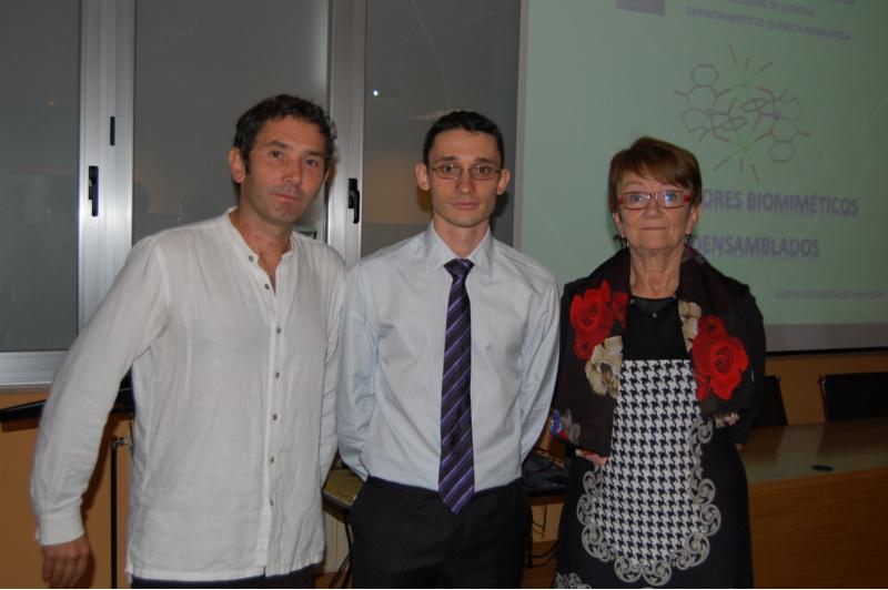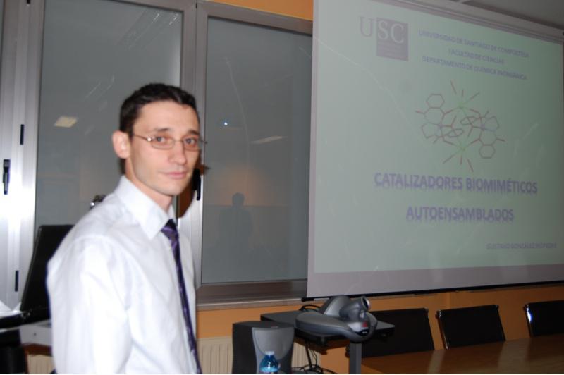 A investigación desenvolvida por González Riopedre está recollida na tese de doutoramento ‘ Catalizadores Biomiméticos autoensamblados’, dirixida polos profesores do Departamento de Química Inorgánica da USC María Isabel Fernández García e Marcelino Maneiro Maneiro, e que cuxas conclusións foron presentadas por González Riopedre na Facultade de Ciencias do campus de Lugo. A tese de doutoramento presentada e defendida por este investigador asturiano formado no campus lugués ante un tribunal presidido polo catedrático do Departamento de Química Inorgánica da Universidade de Santiago José Sordo, destaca a importancia da investigación na síntese de novos modelos artificiais de manganeso capaces de mimetizar o comportamento catalítico da fotosíntese da auga ou doutros enzimas naturais como as catalasas ou peroxidasas. A fotosíntese é o proceso polo que as plantas e outros organismos transforman a enerxía da luz solar en enerxía química, a cal despois utilizan para desenvolverse. A consecución de modelos artificiais que repliquen este proceso preséntase como unha vía atraínte para acadar unha fonte de enerxía inesgotable, salienta este investigador. Asemade, os enzimas catalasas e as peroxidasas están implicadas nos mecanismos de defensa contra o estrés oxidativo provocado polas especies reactivas de osíxeno que aparecen como consecuencia da respiración (radicais hidroxilo, peróxido de hidróxeno, etc.). González Riopedre relata neste senso que os modelos miméticos destes enzimas poden ter potencial aplicabilidade tanto no ámbito da biomedicina como tamén en procesos industriais onde se utilizan este tipo de especies para realizar oxidacións, por exemplo, nos procesos de branqueo na industria alimentaria, téxtil ou da madeira. Os novos modelos sintetizados e estudados nesta tese de doutoramento baséanse nun coidado deseño dos ligandos que estabilizan ao ión manganeso. Estes ligandos, ademais de facilitar a rede de interaccións supramoleculares, deben ter a capacidade de estabilización do manganeso en estados de oxidación elevados para así poder realizar as funcións oxidativas que realizan as manganoenzimas nos procesos biolóxicos nos que participan. A investigación desenvolvida por González Riopedre permite determinar que a xeometría ao redor do ión manganeso é un factor decisivo para optimizar as actividades catalíticas. Outra das achegas recollidas nesta tese de doutoramento é a que atinxe á comprobación de como a autoensamblaxe dos complexos a través das interaccións intramoleculares incide na efectividade destas capacidades catalíticas. Tribunal da tese O tribunal encargado de avaliar a tese de doutoramento presentada e defendida por Gustavo González Riopedre baixo o título ‘Catalizadores biomiméticos autoensamblados’ estivo presidido polo catedrático da USC José Sordo Rodríguez. A profesora do Departamento de Química Inorgánica da institución académica compostela Ángeles Sánchez; o catedrática da Universidade de Burgos, Javier García Tojal; Jesús José Fernández, da Universidade da Coruña, e Delfina Couce, da Universidade Vigo, completan a formación do tribunal, que outorgou a máxima cualificación á investigación desenvolvida por González Riopedre. Gustavo González Riopedre, na presentación da súa tese de doutoramento na Facultade de Ciencias