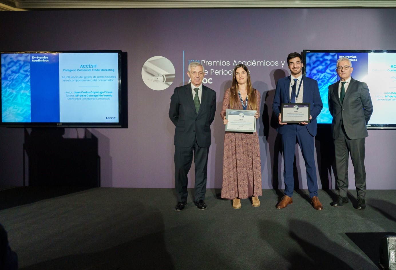 O alumno Juan Carlos Capolugo, estudante do mestrado en Dirección de Empresas da USC, e a súa titora, Mª Concepción Varela Neira, profesora de Comercialización e Investigación de Mercados da USC, acaban de recibir, no marco dos Premios Académicos AECOC pola Competitividade Empresarial, o accésit na categoría de Marketing que concede a Asociación de Empresas do Gran Consumo polo traballo fin de grao ‘A influencia do xestor de redes sociais no comportamento do consumidor’.