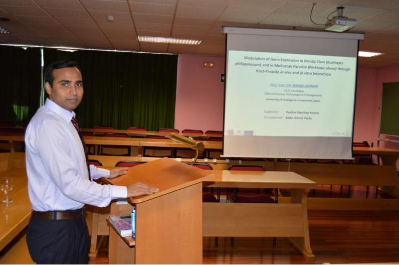 A tese ‘Modulación da expresión xenética na ameixa de Manila (Ruditapes philippinarum) e do parasito de moluscos (Perkinsus olseni) a través da relación en vivo anfitrión parasito e en interaccións in vitro’, que vén de presentar na Facultade de Veterinaria do Campus terra da USC Abul Farah Md. Hasanuzzaman, da Khulna University de Bangladesh, trata de responder a algúns dos principais interrogantes que existen sobre a perkinose, unha enfermidade provocada polo parasito Perkinsus olseni e que está a pór en risco a produción da ameixa xaponesa (Ruditapes philippinarum), un dos principais contribuíntes á produción mundial de bivalvo e unha das especies de moluscos con maior nivel de produción en Galicia e en España.