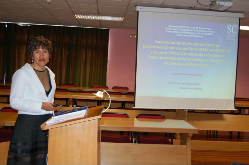 O desenvolvemento deste estudo centrou a tese de doutoramento ‘Caracterizarción molecular de cepas de Escherichia coli do grupo clonal O25b:H4-B2-ST131 e doutros clons causantes de infeccións extraintestinais en seres humanos. Xenes de virulencia e de resistencia’. Esta investigación, desenvolvida pola boliviana Rosalía Seferina Mamani Huarani baixo a dirección dos profesores da USC Jorge Blanco Álvarez e Miguel Blanco Álvarez, conclúe que o éxito da diseminación das cepas do grupo clonal O25b:H4-B2-ST131 responde á súa capacidade de diversificación xenética , así como ao numeroso arsenal de xenes de virulencia e resistencia a antibióticos que presentan as cepas dun grupo clonal que é o máis prevalente na actualidade e que causa numerosas infeccións urinarias e sepsis en seres humanos de todo o mundo. Nos hospitais españois, do mesmo xeito que sucede a nivel mundial está a aumentar de forma significativa a prevalencia de cepas produtoras de beta lactamasas de espectro estendido (BLEE) e moi especialmente de CTX-M-15, debido á emerxencia do grupo clonal O25b:H4-B2-ST131, segundo se indica nas conclusións desta investigación, nas que tamén se precisa que a existencia de numerosos xenes de virulencia neste grupo clonal de E. coli non está asociado cun incremento da mortalidade. A investigadora boliviana realiza na súa tese de doutoramento unha clasificación das cepas do grupo clonal O25b:H4-B2-ST131 en diversos virotipos, que poden representar distintos subclóns, atendendo aos seus xenes de virulencia. Na análise de cepas ST131 bacteriémicas illadas no Hula, Rosalía Seferina Mamani Huarani detectou que os tres subclóns maioritarios (H30-Rx; H30 no Rx e H22) son so mesmos que os apreciados noutros estudos desenvolvidos recentemente en EE.UU. e Canadá. Tribunal e cualificación O tribunal encargado da avaliación e cualificación da tese de doutoramento que vén de presentar Rosalía Seferina Mamani Huarani na Facultade de Veterinaria do campus de Lugo da USC estivo presidido por Montserrat Llagostera Casas, da Universidade Autónoma de Barcelona. María Rosario Rodicio Rodicio, da Universidade de Oviedo; Fernando García Garrote, do Hula; Germán Bou Arévalo, do Chuac, e Carlos García Riestra, do CHUS, tamén formaron parte do tribunal, que outorgou a máxima cualificación académica á tese de doutoramento desenvolvida pola investigadora de Bolivia Rosalía Seferina Mamani Huarani.