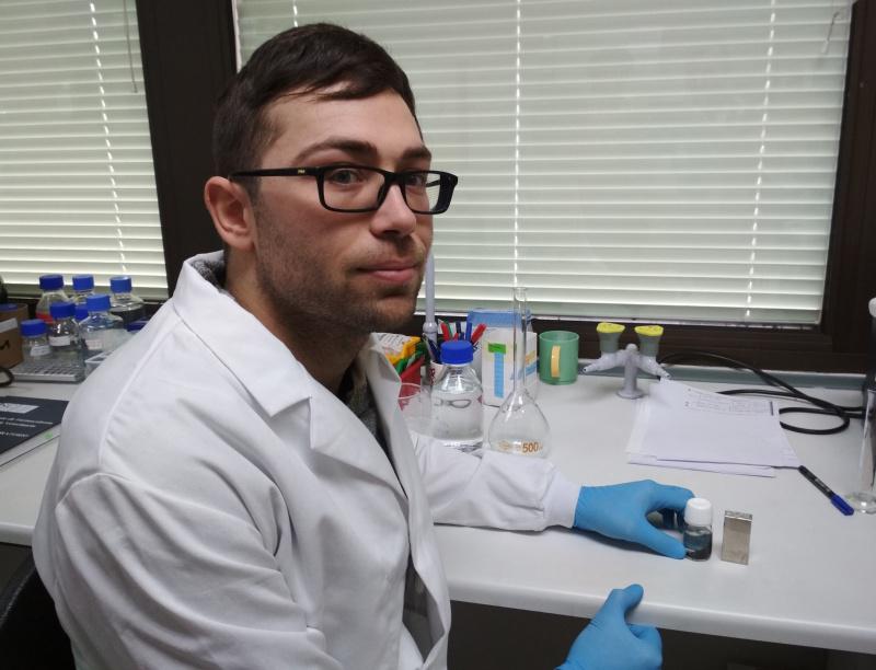 Un dos investigadores implicados na patente, con nanopartículas magnetoquímicas e un imán, no laboratorio de Farmacoloxía da Facultade de Veterinaria