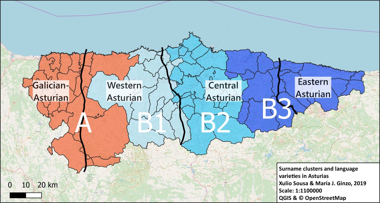 “Os resultados obtidos na investigación amosaron moitas similitudes na distribución das rexións de apelidos con áreas dialectais recoñecidas polos estudos de dialectoloxía tradicional”, explica o profesor Xulio Sousa, quen asina o artigo publicado en Journal of Linguistic Geography xunto coa investigadora María José Ginzo Villamayor. “Os estudos sobre as correlacións entre a distribución espacial das variedades lingüísticas e a estrutura xenética das poboacións comezaron tratando espazos xeográficos e familias lingüísticas extensas”, apuntan os autores. Nas dúas últimas décadas, os investigadores deste enfoque interdisciplinario tamén comezaron a estudar dominios lingüísticos e poboacionais máis reducidos. O artigo examina información xeolingüística e onomástica nun espazo lingüístico e administrativo dunha extensión limitada, o Principado de Asturias.