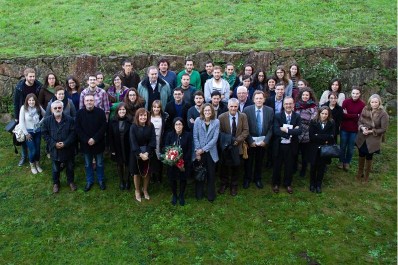 Esquema do proceso de remediación do solo contaminado con contaminantes orgánicos hidrófobos empregando un aceite vexetal como disolvente (Esquema Patente nº 1) Esquema do reactor encimático de membrana cerámica (Esquema da Patente nº 2) Adriana Arca, no centro, cos directores e tribunal da tese (Foto: Iria, Biogroup) Foto de grupo dos asistentes ao acto de lectura da tese de Adriana Arca (Foto: Iria, Biogroup)